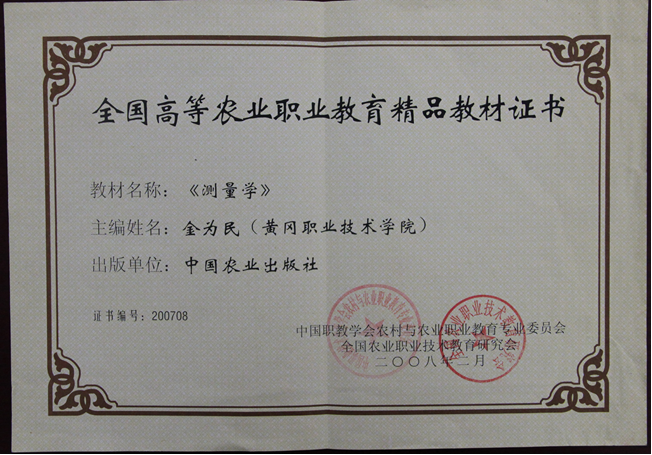 ◆主编的《测量学》教材被评为普通高等教育“十一五”国家级规划教材,并被评为全国农业职业教育精品教材。