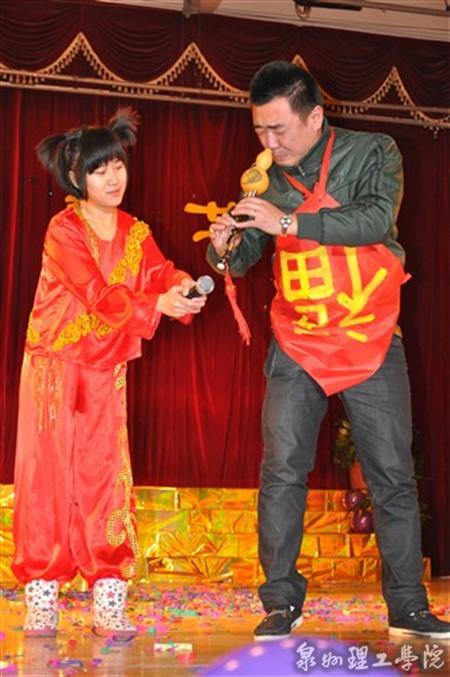 晚会现场布置得格外温馨,由陈丹表演的歌伴舞《欢乐中国年》拉开了本场晚会的序幕。车辆系选送的舞蹈《新第八套广播体操》,身系红领巾的“小学生们”以舞蹈串烧的形式,在大家熟悉的旋律中加入新的搞笑元素,精彩的表演博得场下观众阵阵掌声,掀起了晚会高潮。教务处刘皿伟处长带来的小提琴演奏《茉莉花》,那婉转灵动的音符,配上学生饶婷甜美动听的演唱,带给大家余音绕梁的感觉。党政办的四句半《你不知道的事》以诙谐幽默,朗朗上口的语言诉说了国家、学校的成长和发展,与大家一起回顾了凝聚着理工人心血和汗水的奋斗史和辉煌史。车辆系的东北二人转以搞笑的装扮,夸张幽默的表演不时引得全场观众捧腹大笑。信息系选送的节目《今生共相伴》,更是以重现结婚现场的创意形式,新郎郑文杰、新娘吴丽萍身着礼服婚纱,与在场教职工重温两人结合的温馨幸福时刻。