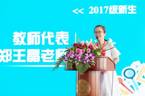 酒店管理专业郑王晶主任作为教师代表发言,她表示作为一名新时代的大学生除了武装自己的头脑,锻炼好自己的体魄,更要有丰富的内涵,要“学做人、懂感恩、知回报”,希望同学们在这最美好的青春年华通过读书增加知识,激活潜能,充实立体生命。