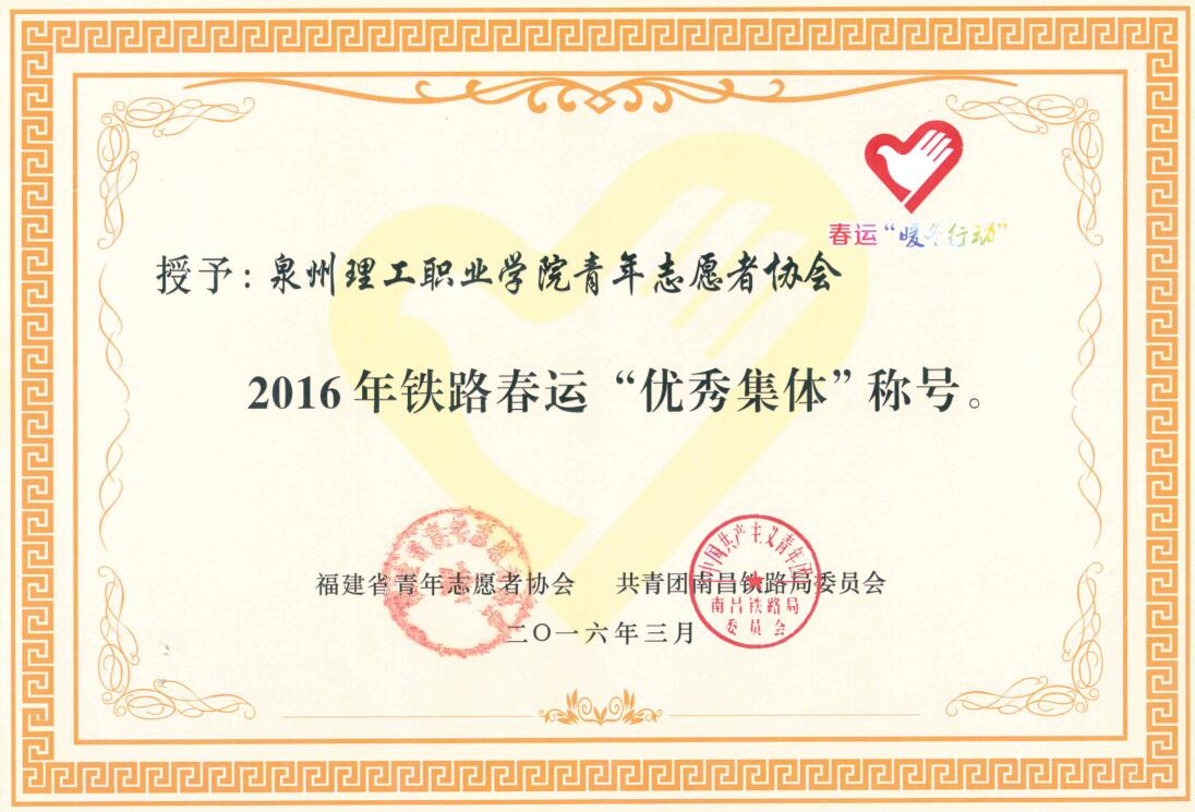 为表彰先进,鼓舞青年,全国铁道团委对 2016 年春运工作中的优秀青年志愿者和春运工作中的先进集体及优秀个人进行表彰。我校 2014 级商学院会计专业学生方燕珠被全国铁道团委、全国铁路青年志愿者协会评为“青年志愿者优秀个人”。校青协也被福建省青年志愿者协会、共青团南昌铁路局委员会评为 2016 年铁路春运“优秀集体”。
