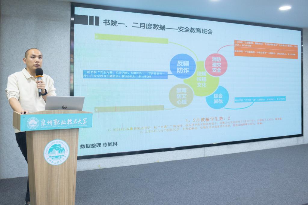 蔡金佩围绕重点学生工作提出四点具体要求,一是守牢安全底线,压实责任体系。筑牢思想意识阵地,强化学生心理健康,加强对学生人身安全、公共安全教育,营造安全稳定的育人环境。二是深耕思政育人,创品牌强内涵。以学生为主体,以学院和书院为两翼,强化思政引领力,五育融合促进学生全面发展,实现专业教育与思政教育的有机融合,构建三全育人新格局。三是强化双院协同,凝聚育人合力。加强专业学院与主题书院、专业课程与活动课程、校企合作与校地共建等多方面协同,凝聚合力协同育人。四是抓队伍提效能,人工智能拓新局。持续推进学工干部素质能力提升工程,加强理论研究,增强核心素养提升能力水平,持续推进智慧学工建设,提升管理服务水平。