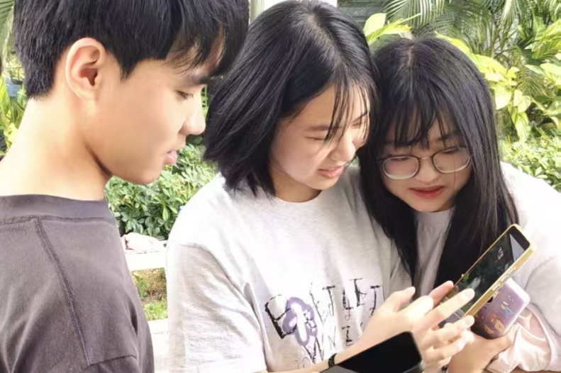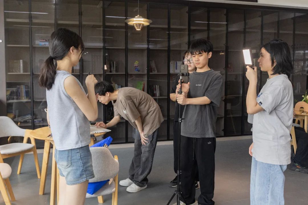 王琬艺(右一)与同学讨论媒体运营