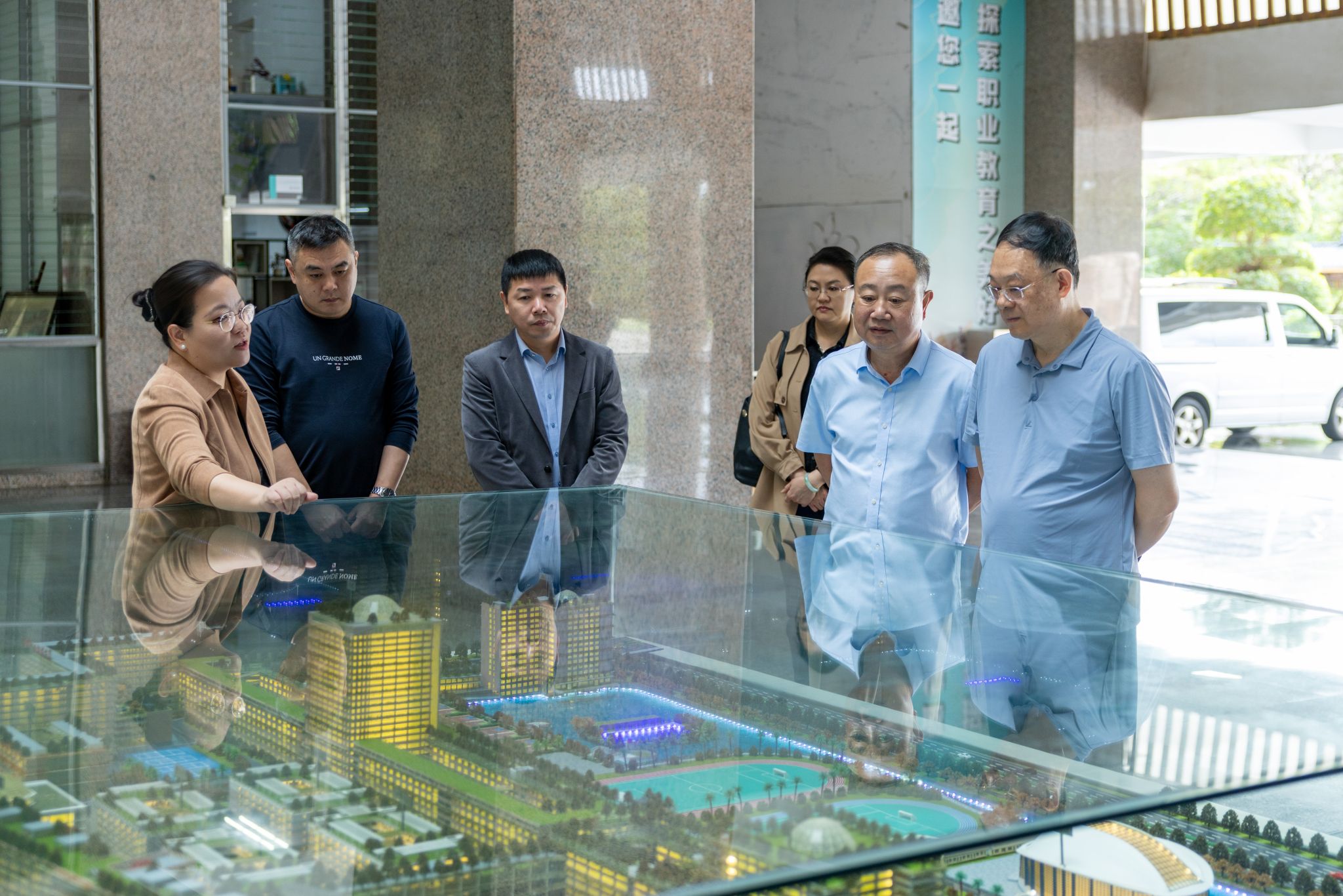 严可仕一行实地走访了我校生态校园沙盘及校史馆。参观过程中,校领导围绕学校发展沿革、办学特色与成果等方面作详细介绍。