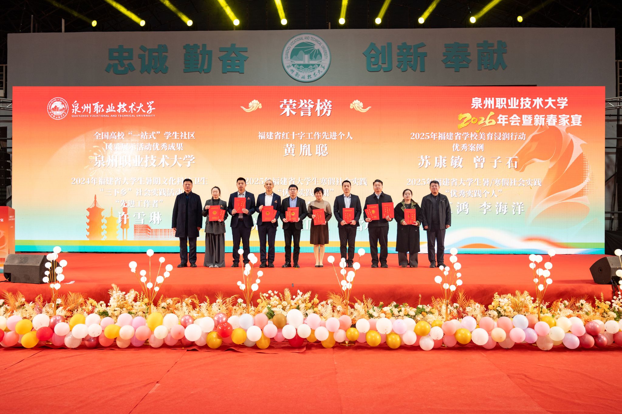 1月20日,泉州职业技术大学隆重举行2026年会。学校创办人、董事长吴金营,泉大教育基金会理事长杨培琛,校长吴滨如,党委书记傅志雄,全体校领导、教职工及产业伙伴代表、南非培训学员参加。年会由傅志雄书记主持。