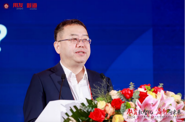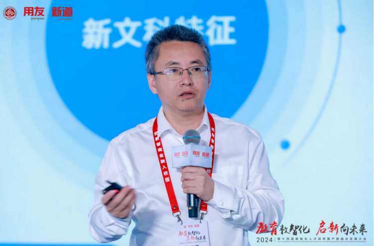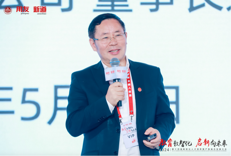 新道科技股份有限公司副总裁贾大明以“教育数智化 启新向未来—新质生产力时代下的产教融合新基建”为题作主题演讲。他表示,发展数字经济就是发展新质生产力,数智人才就是新质人才,新质人才特征是更懂硬科技、更懂数据、更懂产业,培养新质人才要围绕能力构建产教融合、运用科技构建产教融合。贾大明介绍,新道科技以产业态势感知平台,聚焦人才供需适配;以产业链认知平台,构建产业全局思维;以企业认知实践平台,构建企业全局思维;以商科专业创新平台,构建场景+、科技+、数据+;以工科专业创新平台,构建场景+、科技+、装备+;以跨专业综合实践平台,聚焦学科交叉综训;以能力训赛平台,聚焦能力鉴定与竞技;以数智科研平台,助力教师科研创新;以产教融合大脑,聚焦产教资源平衡。贾大明表示,新道科技是产教融合战略伙伴,能构建用友生态全流程、多形态的闭环合作;是产教融合最佳伙伴,通产业、懂教育、富科技、有情怀;是产教融合务实伙伴和未来伙伴,围绕人才培养的基本面开展落地行动。