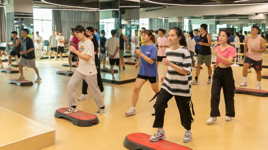 “有氧踏板操的动作变化大、娱乐性很强,能很好训练同学们的身心。”当天,文化旅游与体育学院2020级休闲体育专业学生的“开学第一课”,在操课实训室拉开帷幕。教室里,音响正在播放旋律轻快的音乐《Dance Monkey》,赵雨洒老师微笑地让学生们跟着动作,一起跳起有氧踏板操。她面对一墙高的大镜子,伴随音乐节奏示范着动作。学生们刚接触有氧踏板操,对节奏和动作比较生疏,但脸上都洋溢着灿烂的笑容。开学第一课,她特地安排这节有氧踏板操,“踏板操的音乐欢快、节奏感强,可以积极引导学生从假期收起心来,把注意力全都投入到学习。”