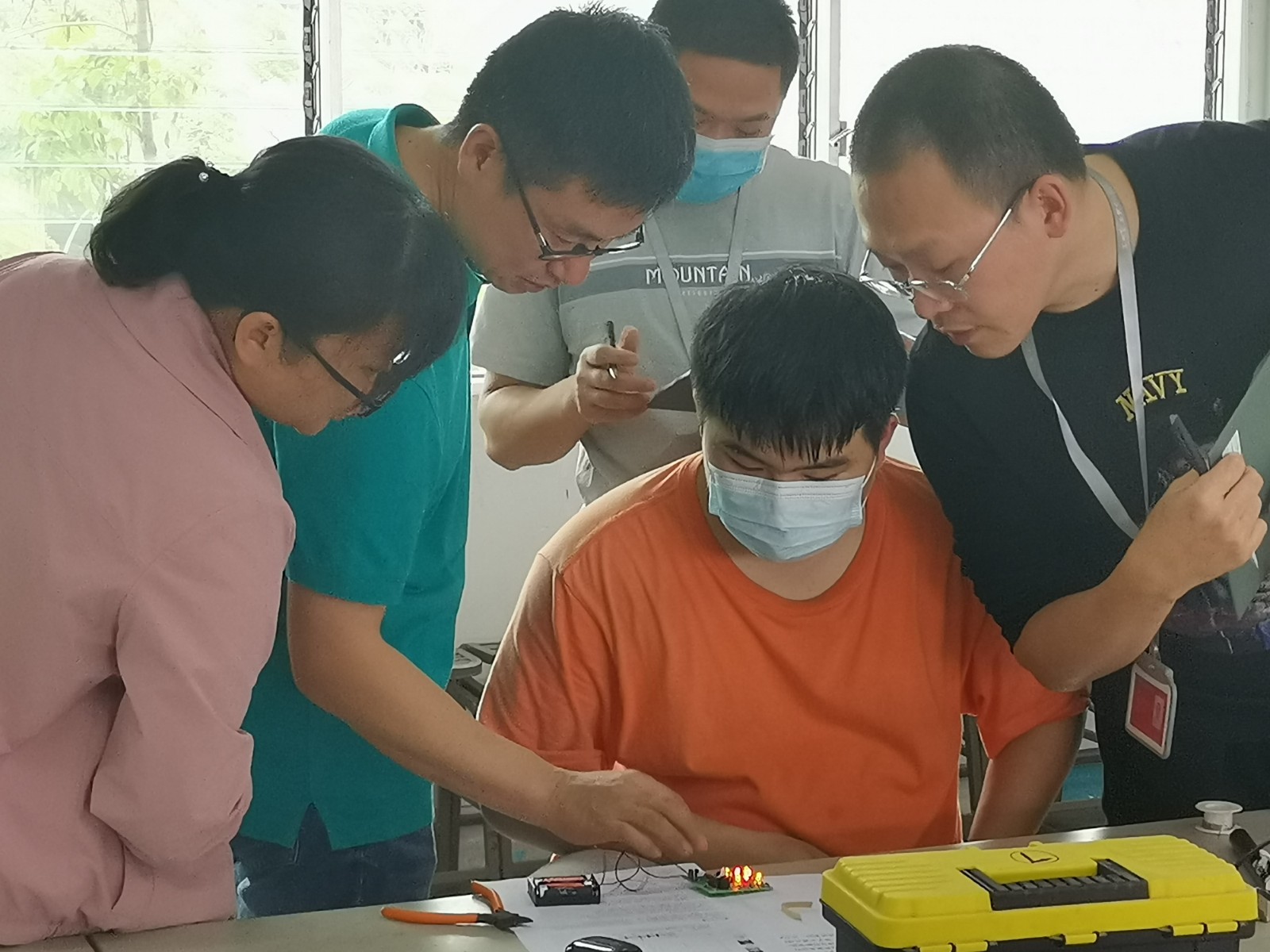 经过1小时的比赛及考评,只有三位学生在规定的时间里完成了自己作品的制作,其余同学虽然超过了时间,但他们依然坚持将电路制作完成。