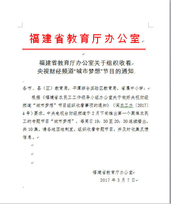 近日,接到福建省教育厅办公室发文,要求学校组织观看中央电视台财经频道“城市梦想”专题节目的通知。